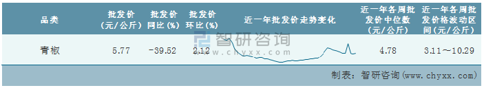 根據農村農業部數據統計可知:2022年第3周全國青椒平均批發價為5.77元/公斤,同比下跌39.52%,環比增加2.12%,近一年全國青椒平均批發價最高達到10.29元/公斤,批發價最低也要3.11元/公斤。