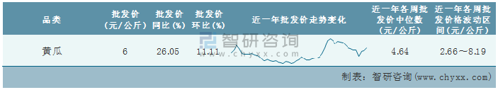 根據農村農業部數據統計可知:2022年第3周全國黃瓜平均批發價為6元/公斤,同比增加26.05%,環比增加11.11%,近一年全國黃瓜平均批發價最高達到8.19元/公斤,批發價最低也要2.66元/公斤。