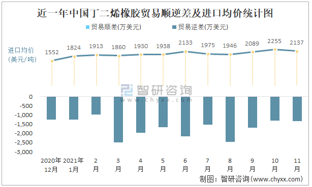 近一年中國(guó)丁二烯橡膠順逆差及進(jìn)口均價(jià)統(tǒng)計(jì)圖
