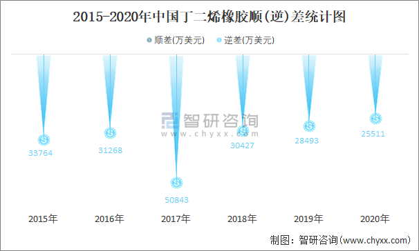 2015-2020年中國(guó)丁二烯橡膠順(逆)差統(tǒng)計(jì)圖