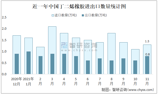 近一年中國(guó)丁二烯橡膠進(jìn)出口數(shù)量統(tǒng)計(jì)圖