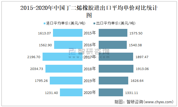 2015-2020年中國(guó)丁二烯橡膠進(jìn)出口平均單價(jià)對(duì)比統(tǒng)計(jì)圖