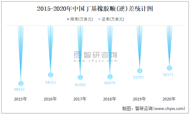 2015-2020年中國丁基橡膠順(逆)差統計圖