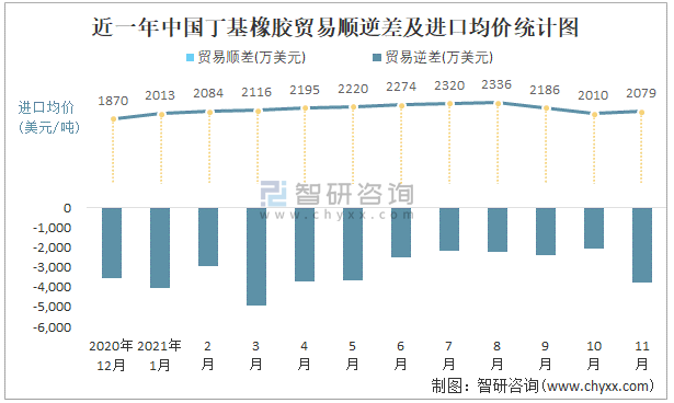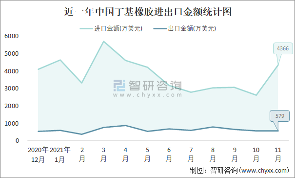 根據中國石油和化學工業聯合會數據顯示:2021年11月中國丁基橡膠進口數量為2.1萬噸,出口數量為0.3萬噸;進口金額為4366萬美元,出口金額為579萬美元;近一年中國丁基橡膠出口總金額小于進口總金額,貿易逆差為主,進口均價2079美元/噸。