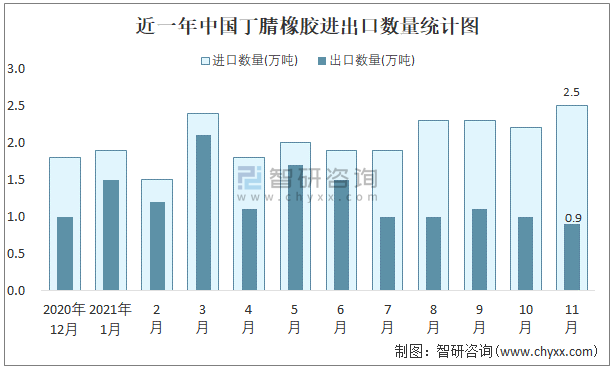 2021年11月中國丁腈橡膠進(jìn)出口數(shù)量分別為2.5萬噸和0.9萬噸