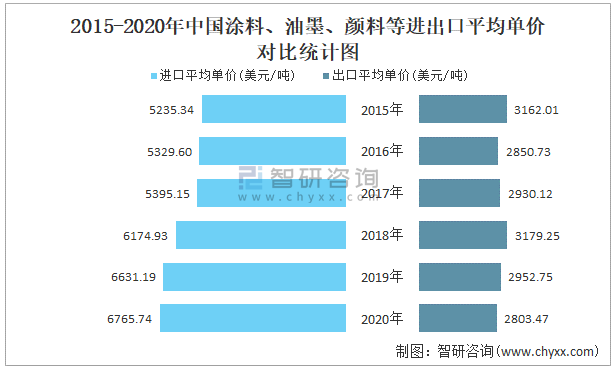 2015-2020年中國涂料、油墨、顏料等進出口平均單價對比統計圖