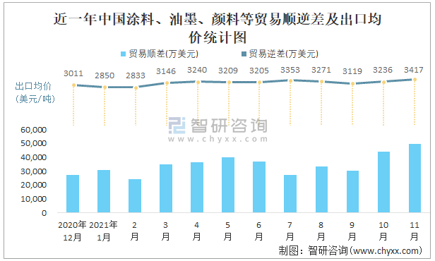 近一年中國涂料、油墨、顏料等順逆差及出口均價統計圖