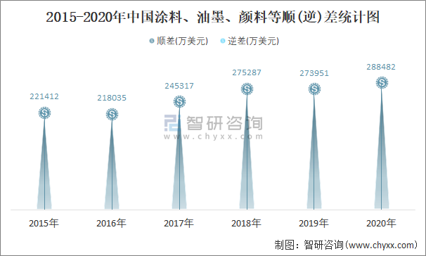 2015-2020年中國涂料、油墨、顏料等順(逆)差統計圖
