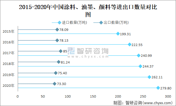 2015-2020年中國涂料、油墨、顏料等進出口數量對比統計圖