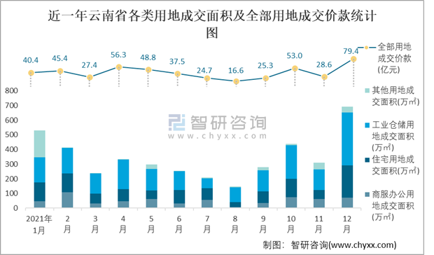 近一年云南省各類用地成交面積及全部用地成交價(jià)款統(tǒng)計(jì)圖