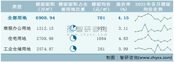 根據(jù)國信房地產(chǎn)信息網(wǎng)數(shù)據(jù)統(tǒng)計(jì)可知:2021年12月云南省全部用地出讓地面均價(jià)為1192元/㎡,其中住宅用地出讓地面均價(jià)最高(2280元/㎡),全部用地成交地面均價(jià)為1148元/㎡,其中住宅用地成交地面均價(jià)為2439元/㎡,高于商服辦公用地成交地面均價(jià);2021年1-12月云南省住宅用地樓面面積占其全部用地比重最多,為39.21%,溢價(jià)率為4.83%。