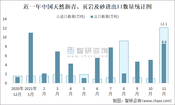 2021年11月中國天然瀝青、頁巖及砂進出口數量分別為12.1萬噸和8.6萬噸