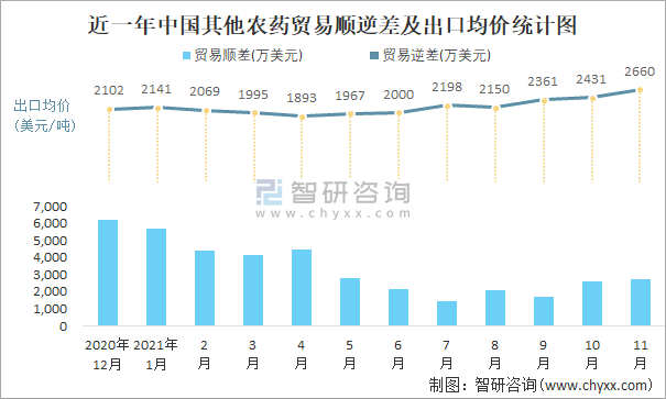 根據中國石油和化學工業聯合會數據顯示:2021年11月中國其他農藥進口數量為0.4萬噸,出口數量為1.9萬噸;進口金額為2314萬美元,出口金額為5054萬美元;近一年中國其他農藥出口總金額大于進口總金額,貿易順差為主,出口均價2660美元/噸。