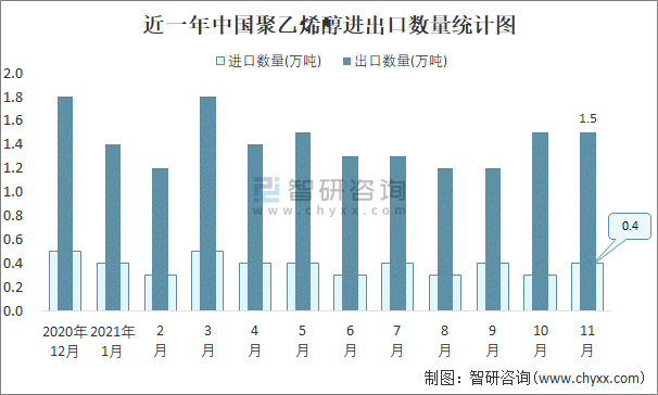近一年中國聚乙烯醇進出口數量統計圖