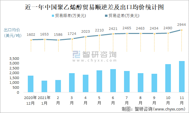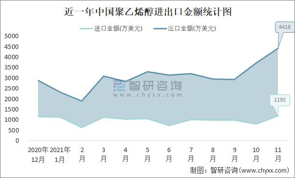 根據中國石油和化學工業聯合會數據顯示:2021年11月中國聚乙烯醇進口數量為0.4萬噸,出口數量為1.5萬噸;進口金額為1195萬美元,出口金額為4416萬美元;近一年中國聚乙烯醇出口總金額大于進口總金額,貿易順差為主,出口均價2944美元/噸。