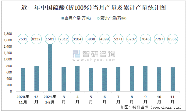 近一年中國硫酸(折100%)當月產量及累計產量統計圖
