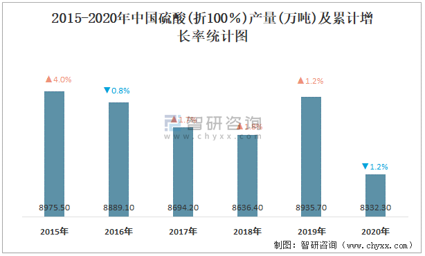 2015-2020年中國硫酸(折100%)產量及累計增長率統計圖