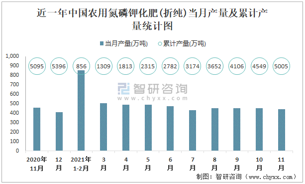 近一年中國農用氮磷鉀化肥(折純)當月產量及累計產量統計圖