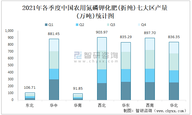 根據國家統計局數據顯示:2021年各季度中國農用氮磷鉀化肥(折純)主要集中在西北、西南、華東地區生產;2021年1-11月中國農用氮磷鉀化肥(折純)產量大區分布不均衡,其中西北地區產量最高,特別是青海省貢獻了最多產量;2021年1-11月中國農用氮磷鉀化肥(折純)各省市產量呈現梯隊式分布,湖北、青海、山東等省產量最多。