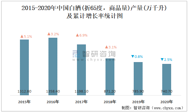 2015-2020年中國白酒(折65度,商品量)產量及累計增長率統計圖