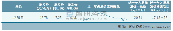 根據農村農業部數據統計可知:2022年第4周全國活鯽魚平均批發價為18.78元/公斤,同比增加7.25%,環比下跌4.48%,近一年全國活鯽魚平均批發價最高達到25元/公斤,批發價最低也要17.12元/公斤。