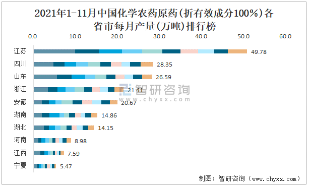 2021年1-11月中國化學農藥原藥(折有效成分100%)各省市每月產量排行榜