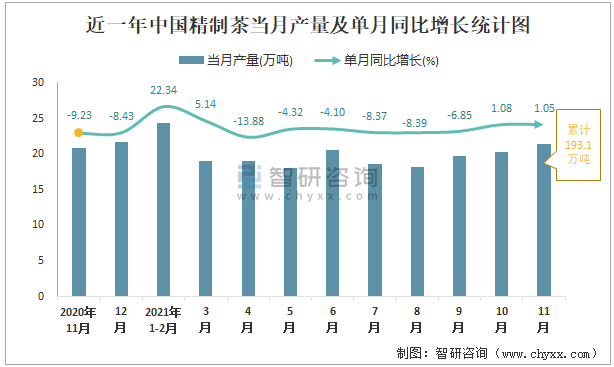 2021年1-11月中國精制茶產(chǎn)量為193.1萬噸 同比下降3.34%