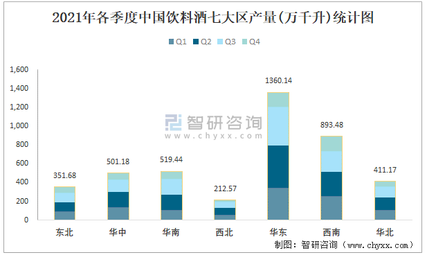 2021年各季度中國飲料酒七大區產量統計圖