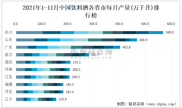 2021年1-11月中國飲料酒各省市每月產量排行榜