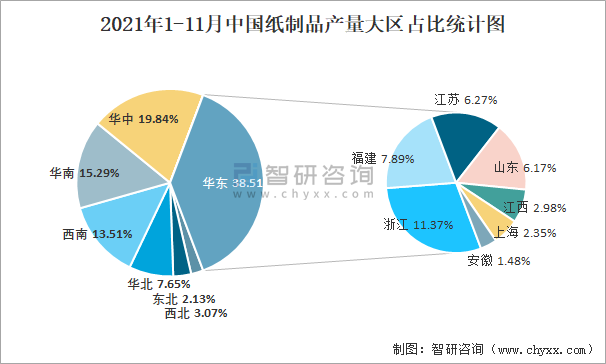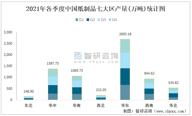 根據國家統計局數據顯示:2021年各季度中國紙制品主要集中在華東、華中、華南地區生產;2021年1-11月中國紙制品產量大區分布不均衡,其中華東地區產量最高,特別是浙江省貢獻了最多產量;2021年1-11月中國紙制品各省產量呈現梯隊式分布,廣東、浙江、福建等省產量最多。