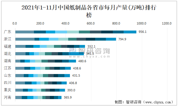 2021年1-11月中國紙制品各省市每月產量排行榜