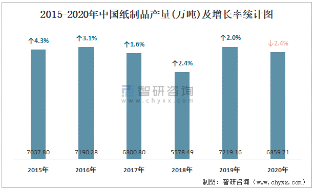 根據國家統計局數據顯示:2021年11月中國紙制品產量為732萬噸,同比增長10.25%;2021年1-11月中國紙制品累計產量為6994萬噸,同比增長10.44%;2015-2020年中國紙制品產量2019年達到最高,次年有所下滑。