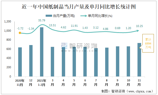 近一年中國紙制品當月產量及單月同比增長統計圖