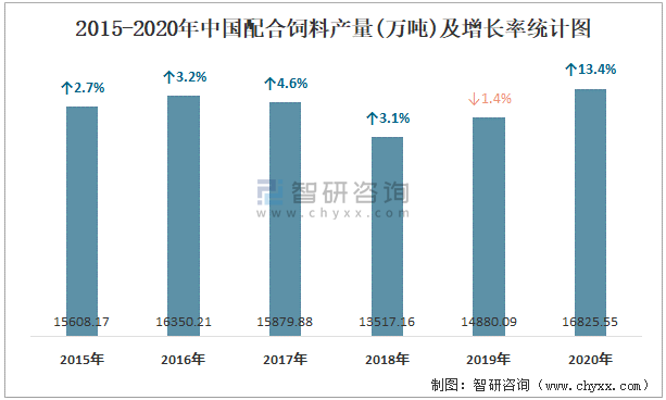 2015-2020年中國(guó)配合飼料產(chǎn)量及增長(zhǎng)率統(tǒng)計(jì)圖