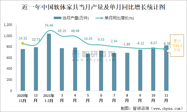 根據(jù)國家統(tǒng)計(jì)局?jǐn)?shù)據(jù)顯示:2021年11月中國軟體家具產(chǎn)量為830萬件,同比下降8.36%;2021年1-11月中國軟體家具累計(jì)產(chǎn)量為7746.3萬件,同比增長10.64%;2015-2020年中國軟體家具產(chǎn)量2019年達(dá)到最高,次年有所下滑。