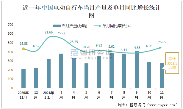 根據國家統計局數據顯示:2021年11月中國電動自行車產量為280萬輛,同比增長26.85%;2021年1-11月中國電動自行車累計產量為3328.1萬輛,同比增長14.91%;2015-2020年中國電動自行車產量2018年跌至最低,此后逐年遞增。