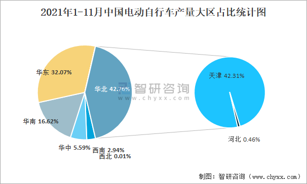 2021年1-11月中國電動自行車產量大區占比統計圖