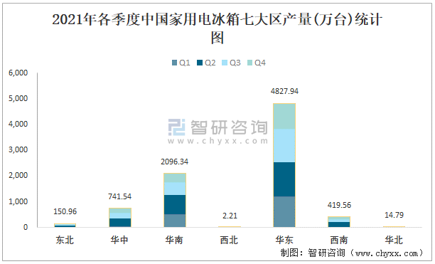 2021年各季度中國家用電冰箱七大區(qū)產(chǎn)量統(tǒng)計(jì)圖