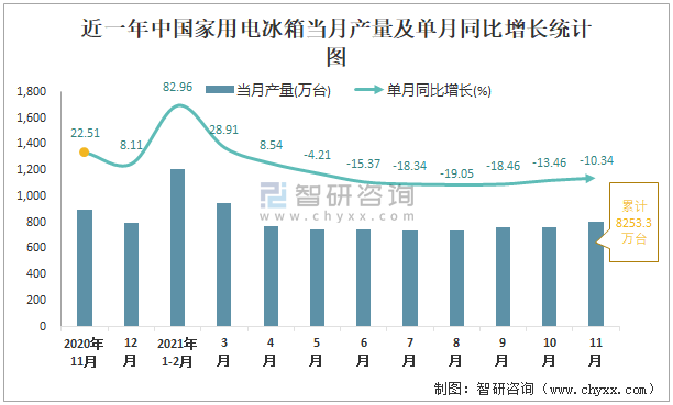 近一年中國家用電冰箱當(dāng)月產(chǎn)量及單月同比增長統(tǒng)計(jì)圖