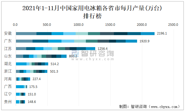 2021年1-11月中國家用電冰箱各省市每月產(chǎn)量排行榜