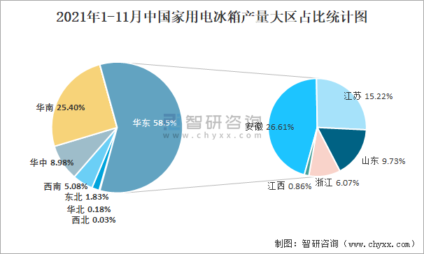 2021年1-11月中國家用電冰箱產(chǎn)量大區(qū)占比統(tǒng)計(jì)圖