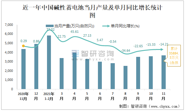 近一年中國堿性蓄電池當(dāng)月產(chǎn)量及單月同比增長統(tǒng)計圖