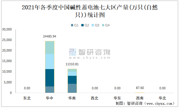 2021年各季度中國堿性蓄電池七大區(qū)產(chǎn)量統(tǒng)計圖