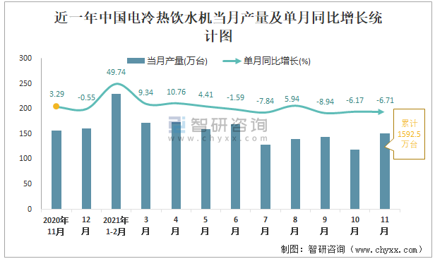根據國家統計局數據顯示:2021年11月中國電冷熱飲水機產量為151萬臺,同比下降6.71%;2021年1-11月中國電冷熱飲水機累計產量為1592.5萬臺,同比增長4.48%;2015-2020年中國電冷熱飲水機產量總體呈現下降趨勢。