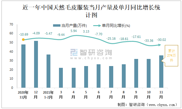 根據(jù)國家統(tǒng)計(jì)局?jǐn)?shù)據(jù)顯示:2021年11月中國天然毛皮服裝產(chǎn)量為36萬件,同比下降30.02%;2021年1-11月中國天然毛皮服裝累計(jì)產(chǎn)量為274萬件,同比下降19.6%;2015-2020年中國天然毛皮服裝產(chǎn)量2017年跌至最低,此后總體呈現(xiàn)上升趨勢(shì)。