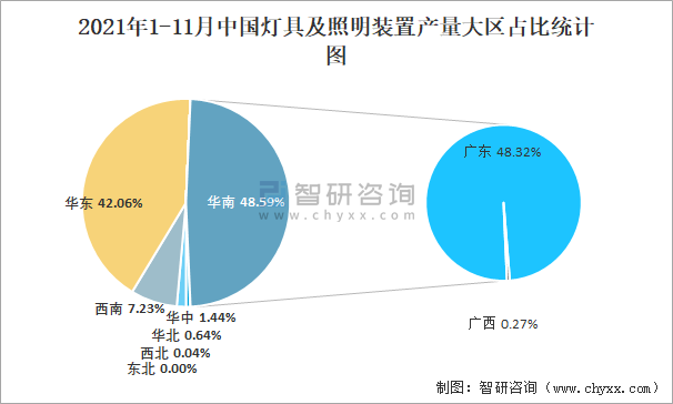 2021年1-11月中國燈具及照明裝置產(chǎn)量大區(qū)占比統(tǒng)計(jì)圖