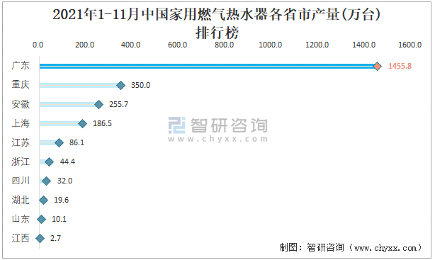 2021年1-11月中國家用燃?xì)鉄崴鞲魇∈挟a(chǎn)量排行榜