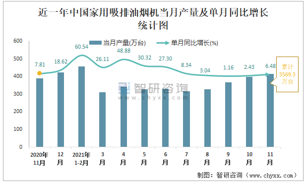 根據國家統計局數據顯示:2021年11月中國家用吸排油煙機產量為415萬臺,同比增長6.48%;2021年1-11月中國家用吸排油煙機累計產量為3569.3萬臺,同比增長18.75%;2015-2020年中國家用吸排油煙機產量2019年達到最高,次年呈現小幅度下滑。