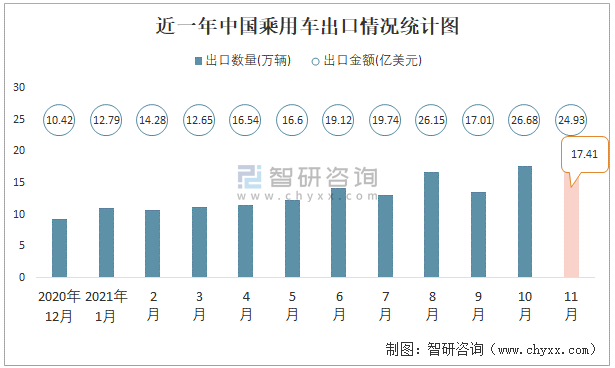 根據(jù)中國海關(guān)數(shù)據(jù)顯示:2021年11月中國乘用車進(jìn)口數(shù)量為8.03萬輛,同比下降24%,進(jìn)口金額為52.67億美元,同比下降0.1%,2021年11月中國乘用車出口數(shù)量為17.41萬輛,同比增長74.8%,出口金額為24.93億美元,同比增長105.9%;2021年1-11月中國乘用車進(jìn)口數(shù)量為86.84萬輛,進(jìn)口金額為487.71億美元,出口數(shù)量為149.24萬輛,出口金額為206.49億美元。