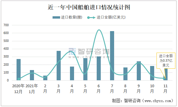 根據(jù)中國海關(guān)數(shù)據(jù)顯示:2021年11月中國船舶進(jìn)口數(shù)量為179艘,同比下降30.6%,進(jìn)口金額為0.37億美元,同比下降43.4%,2021年11月中國船舶出口數(shù)量為357艘,同比下降73.8%,出口金額為19.15億美元,同比增長11.3%;2021年1-11月中國船舶進(jìn)口數(shù)量為2721艘,進(jìn)口金額為28.64億美元,出口數(shù)量為4368艘,出口金額為198.64億美元。